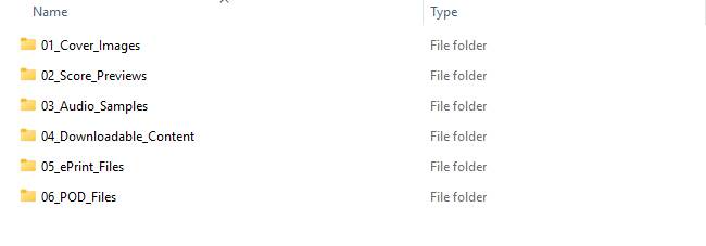 - 01_Review_Assets – Use this folder only when submitting materials for editorial review prior to approval. These files are reviewed internally and are not customer-facing. Full Score’s and MP3 Recordings are requested.